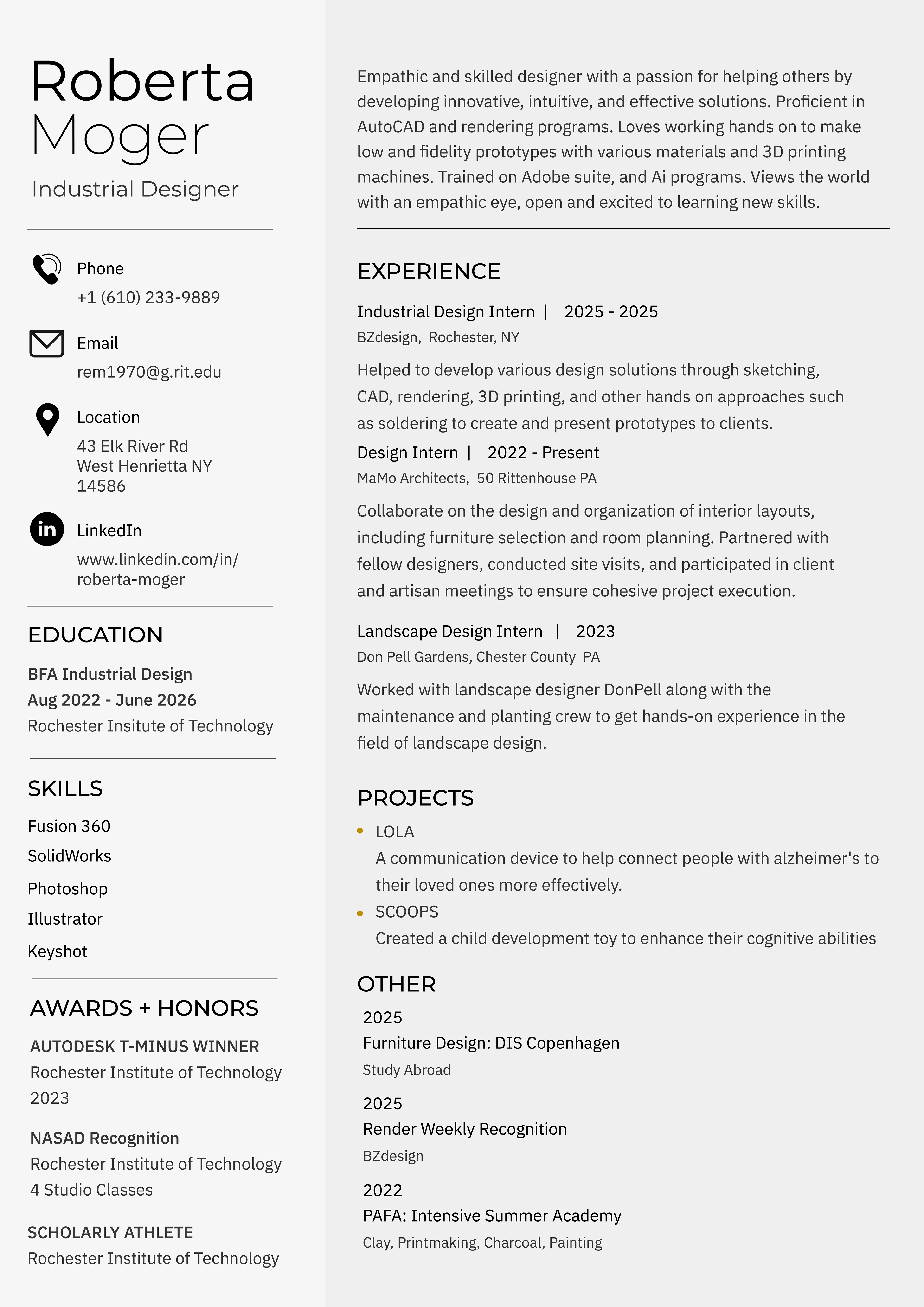 I am a Jr at Rochester Institute of Technology working towards a BFA in Industrial Design. Growing up with my father being an architect opened the door to design for me. He showed me a world where creative minds can come together to tackle challenging problems and the solution is entirely your own. I learned the importance of finding the “right” problem and going to the source to come up with empathic solutions. From the early stages of my life, I knew design was where I wanted to be. My love for creativity combined with being able to solve problems and make a positive impact on the world is what drew me to the field. As a designer, my goal is to enter the world with an empathic eye, one open to learning new skills and helping others.